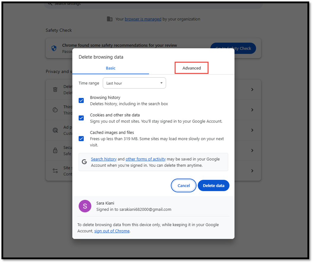 توجه داشته باشید در این روش کش browser  شما خالی می شود و همه تاریخچه سایتهای از قبل باز شده پاک خواهد شد.