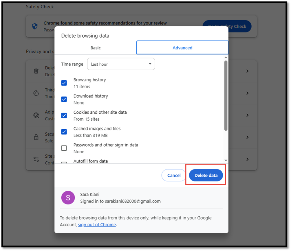 در این قسمت اگر میخواهید صرفا تاریخچه سایتها حذف شود و پسوردهای شما حفظ شود دقت نمایید گزینه Password and other sign-in data  انتخاب نشده باشد و سپس گزینه Delete data  را بزنید.