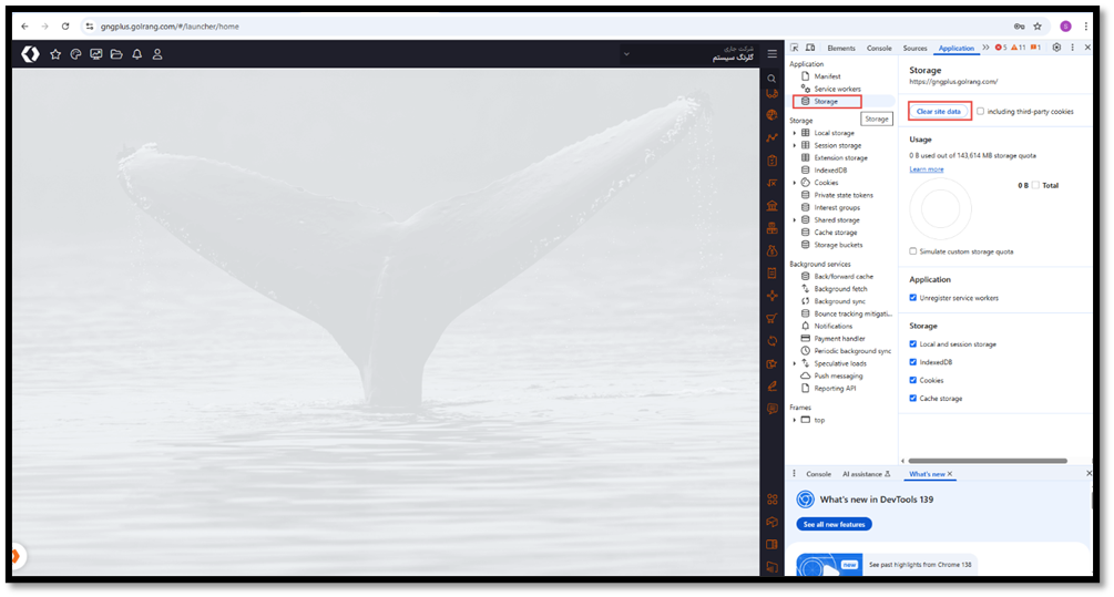 در این قسمت storage را انتخاب کرده و سپس گزینه clear site data  را انتخاب نمایید.